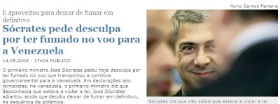 Le Premier Ministre portugais s’est permis une cloppe (ou deux, ou trois) lors d’un voyage officiel au Venezuela, à bord d’un avion requis par l’État, où voyageaient quelques ministres, journalistes et industriels… Histoire d’avoir du pétrole contre quelque chose. Encore un de ces marchés où on ne sait pas qui signe quoi ni avec qui, mais tant pis. Maxime de maitre nuage « là où il y a du poigon règne la confusion … »