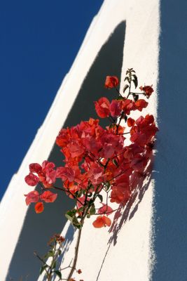 Ces belles fleurs rouges se reposant contre un mur blanc ensoleillé avec pour toile de fond, un ciel bleu, est du plus bel effet.