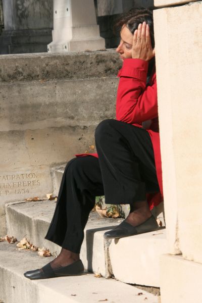 Moi je pense que cette dame posée, est sereine et prend tout simplement un peu le doux soleil en repensant à ceux qu’elle aime.