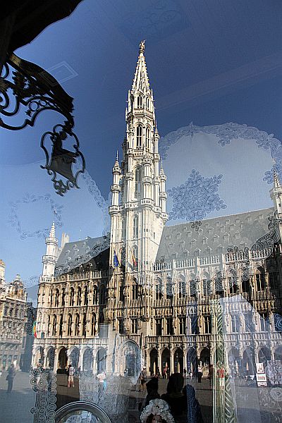 Vitrine de dentelles qui reflète si bien la Grande Place. De beaux souvenirs.